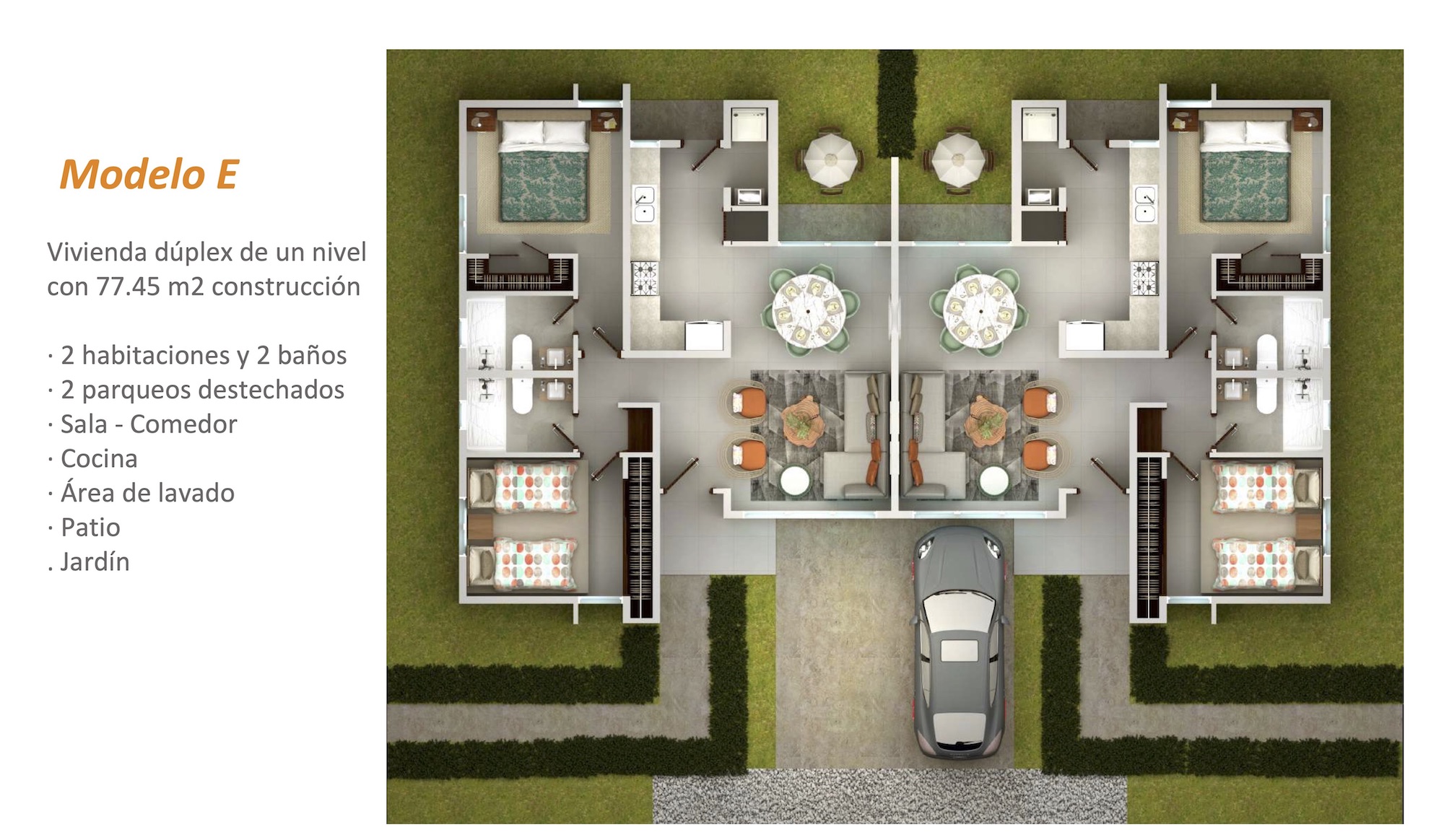· 2 habitaciones y 2 baños · 2 parqueos destechados · Sala – Comedor